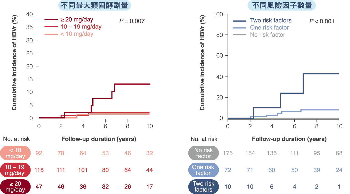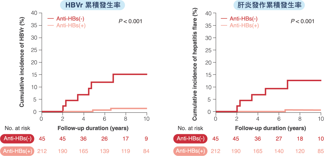 圖一、康復型 B 肝感染的腎移植受贈者 HBVr 與肝炎發作累積發生率